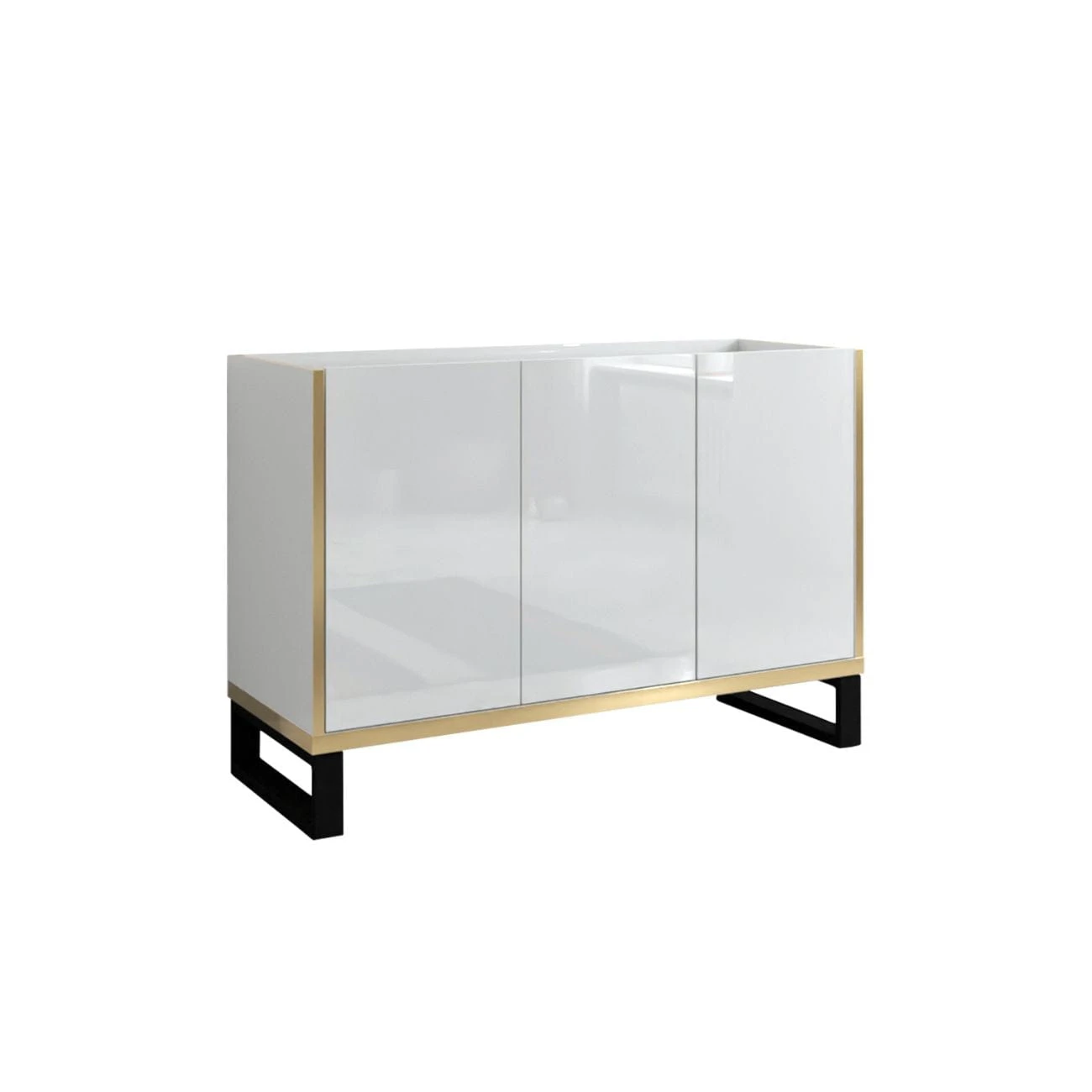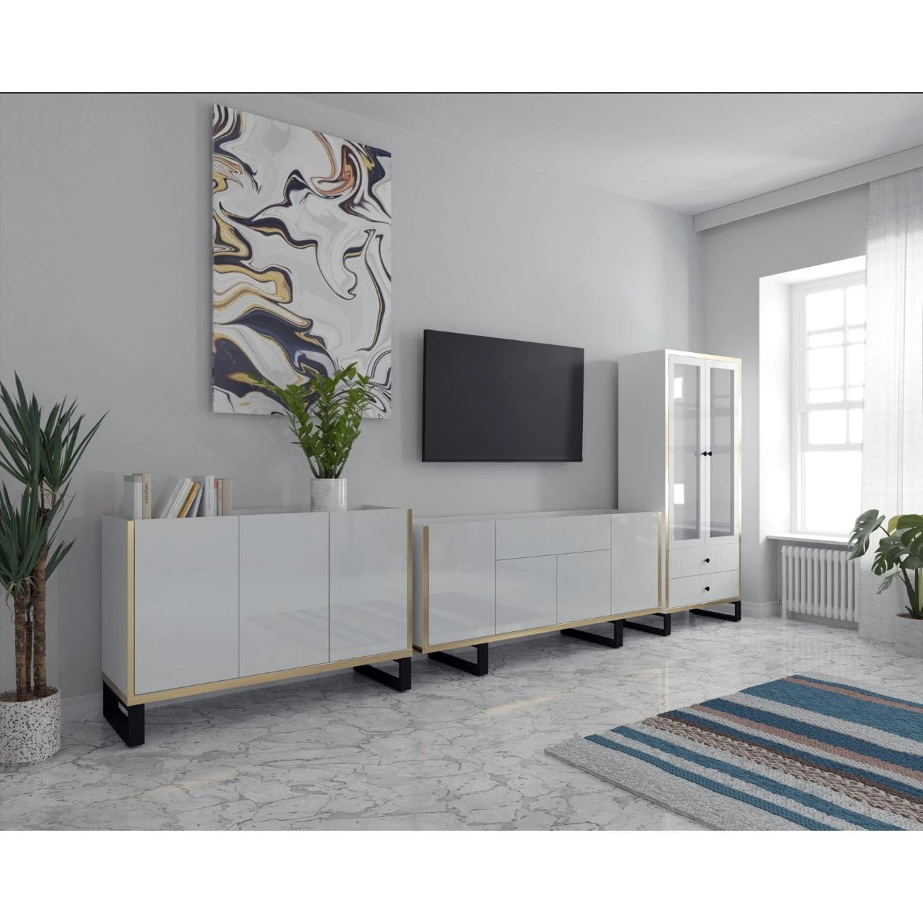 Zestaw mebli do salonu Goldi to nowoczesne połączenie, które z pewnością pokreśli gustowny szyk Twojego salonu. Komoda, witryna oraz szafka RTV posiadają fronty wykonane z białej płyty wykończonej na wysoki połysk. Elegancka, złota wstawka podkreśla klasę mebli, a czarne, metalowe nogi nadają im loftowego stylu.