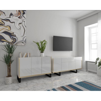 Zestaw mebli do salonu Goldi to nowoczesne połączenie, które z pewnością pokreśli gustowny szyk Twojego salonu. Komoda oraz szafka RTV posiadają fronty wykonane z białej płyty wykończonej na wysoki połysk. Elegancka, złota wstawka podkreśla klasę mebli, a czarne, metalowe nogi nadają im loftowego stylu.