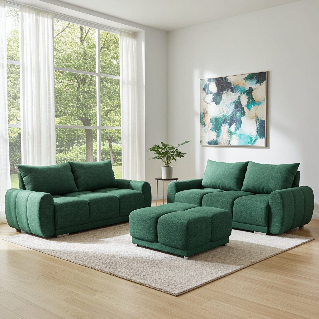 Sercem zestawu jest trzyosobowa kanapa rozkładana z funkcją spania 150×200 cm oraz pojemnikiem na pościel. Towarzyszy jej dwuosobowa sofa z komfortowym siedziskiem o długości 150 cm. Uzupełnia się dużą pufą 98×91 cm na eleganckich, dostępnych na nóżkach, idealnym jako dodatkowe miejsce do zastosowania.