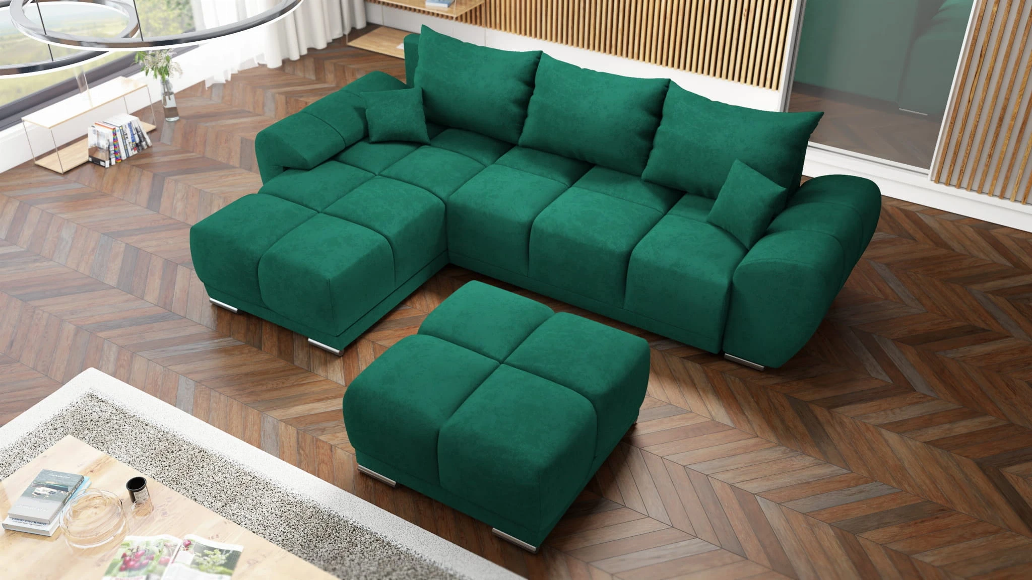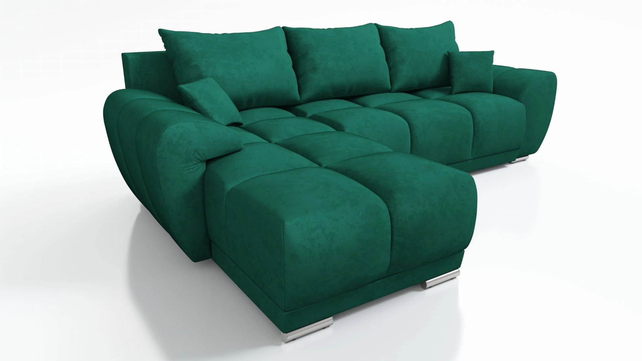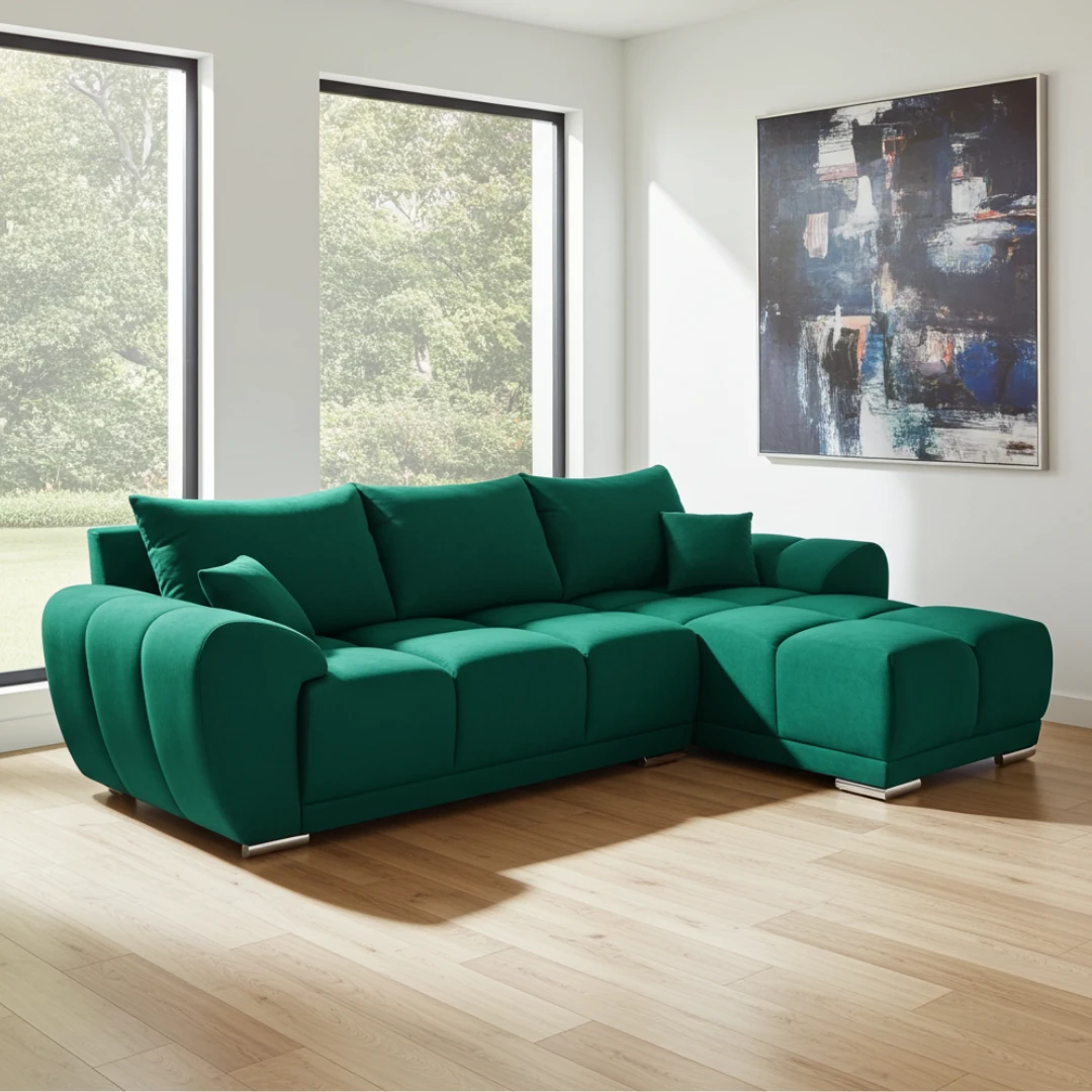 Zielony pikowany narożnik honey l z funkcja spania + pojemnik na pościel