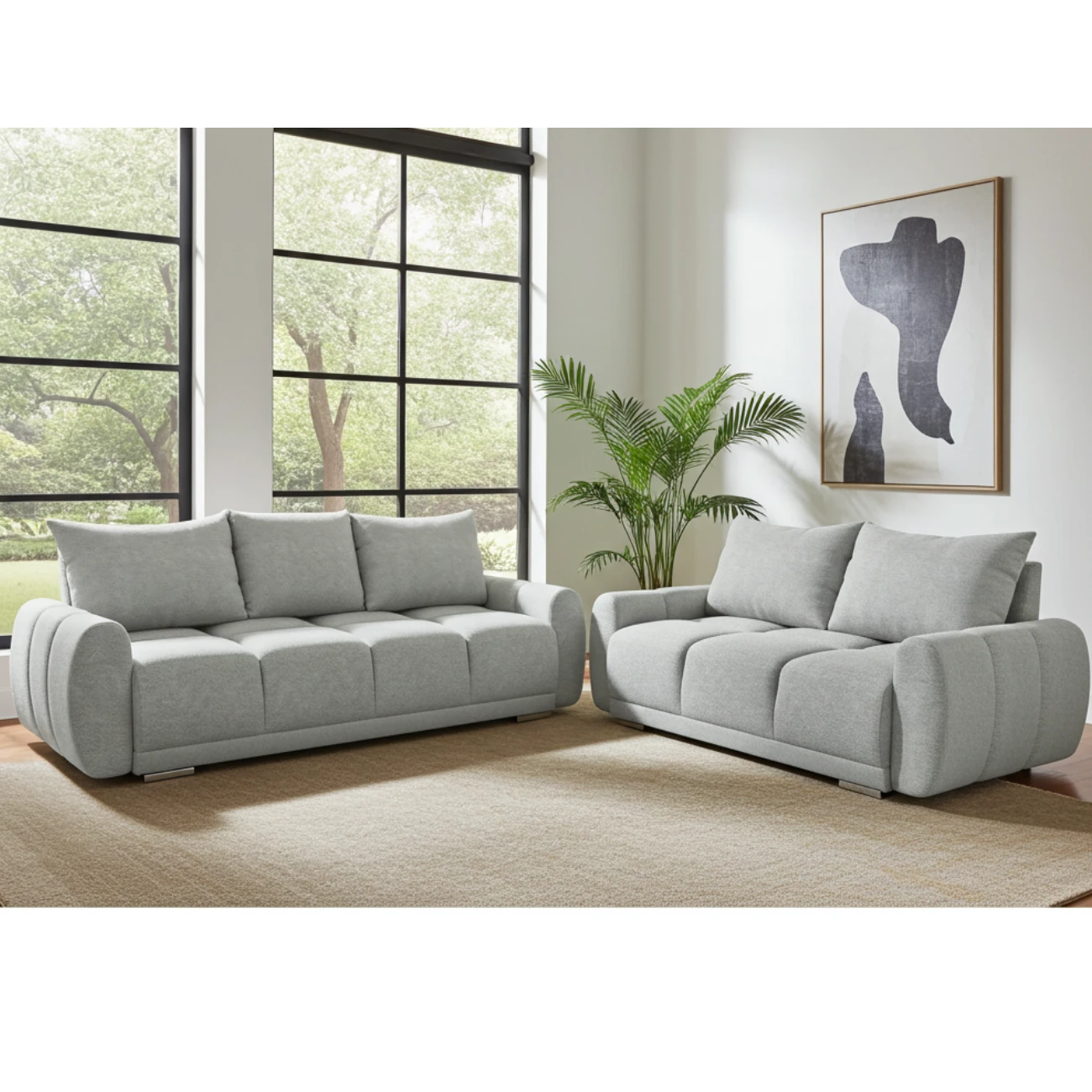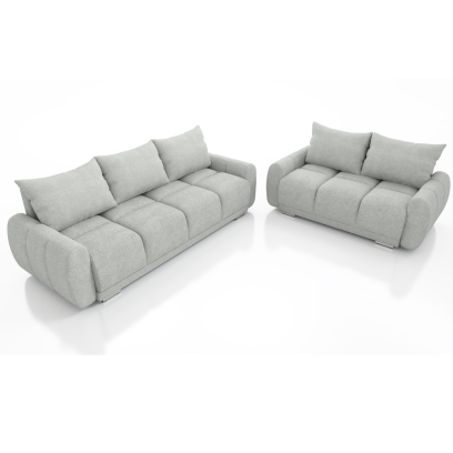 Sercem zestawu jest trzyosobowa kanapa rozkładana Honey z funkcją spania 150x200 cm i dużym pojemnikiem na pościel. Dodatkowo zestaw uzupełnia dwuosobowa sofa o siedzisku 150 cm – wygodna dla dwóch osób.